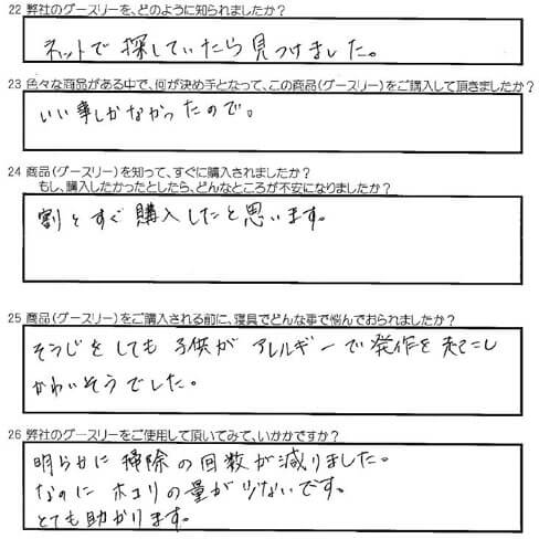 旦那さんが朝起きた際に湿疹(首回り、足等直接寝具と触れる所)がひどい為、病院に行ったところダニアレルギーである事が先日分かった。夫婦で悩んでいた際、この布団を紹介してもらった。 実際に使ってみて、ダニに刺される事がなくなり、旦那さんは非常に喜んで安心して眠れている。