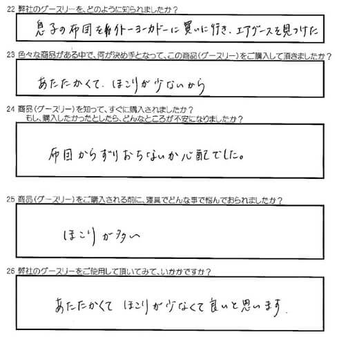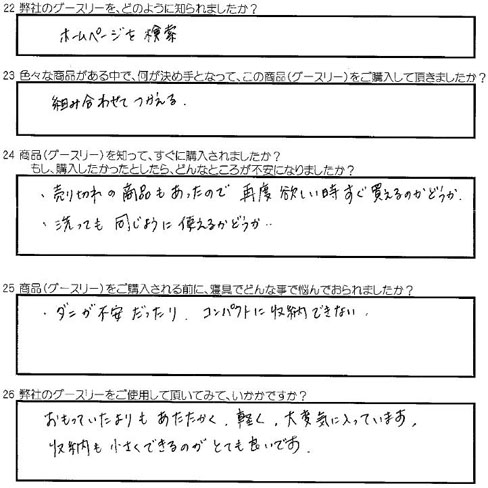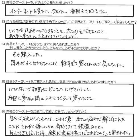 旦那さんが朝起きた際に湿疹(首回り、足等直接寝具と触れる所)がひどい為、病院に行ったところダニアレルギーである事が先日分かった。夫婦で悩んでいた際、この布団を紹介してもらった。 実際に使ってみて、ダニに刺される事がなくなり、旦那さんは非常に喜んで安心して眠れている。